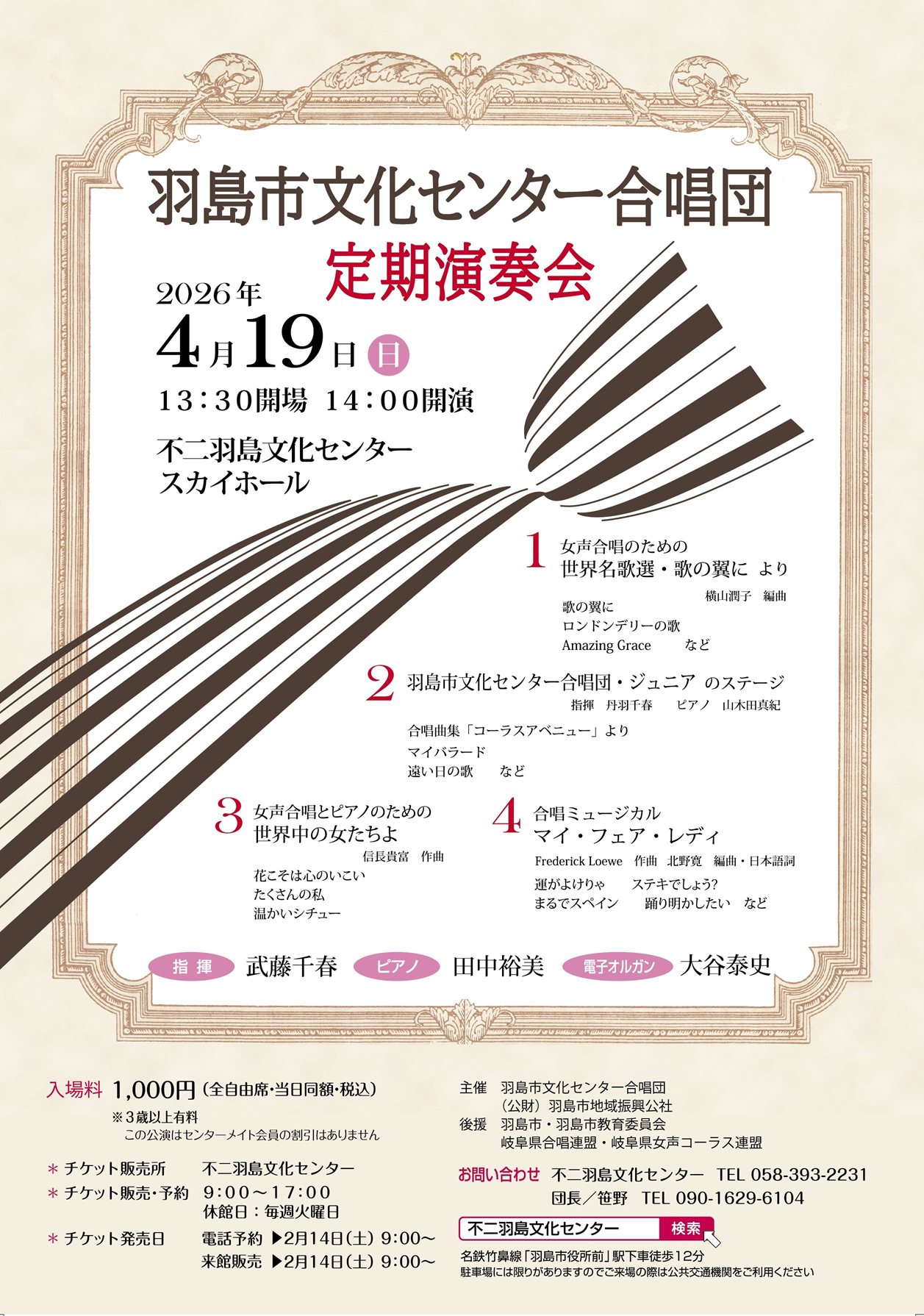画像をクリックで拡大します。 【指揮】 武藤千春 【主催】 羽島市文化センター合唱団、公益財団法人羽島市地域振興公社 【お問い合わせ】 |